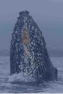 Another unique feature of the humpback whale is the presence of numerous knobby structures, or "tubercles," on the snout and chin. Each tubercle contains a sensory hair. Humpback whales are known for their aerial behavior, breaching, leaping from the water or slapping their tail or flippers on the surface of the water more often than other whales. The humpback is easily identified in Hawai‘i during the winter because it is the only large whale commonly found in nearshore waters.